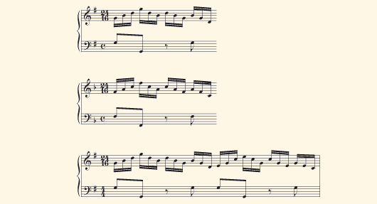 Track 24: Bars 1–5 (plus a dyad) transposed up a semitone, and then again but not transposed.
