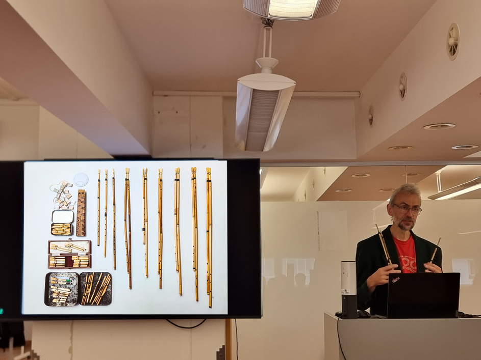 Das Spektrum der besprochenen Themen ging jedoch über die organologischen Schwerpunkte hinaus. Eröffnet wurde die Tagung durch den Vortrag von Dr. Graeme Lawson (Cambridge University), einer der Pioniere der ISGMA, der erst kürzlich mit seinem neu erschienenen Buch „Sound Tracks” die Disziplin der Musikarchäologie einer breiteren Leserschaft vorgestellt hat.[1] Außerdem gab es Berichte aus dem Bereich des musikbezogenen Wissenstransfers im musealen Kontext (Taylor) sowie der systematischen Musikwissenschaft mit der Präsentation einer empirischen musikpsychologischen Studie (Foramitti). Das unbestrittene Highlight der Tagung stellte das Abendkonzert dar, bei dem man verschiedenste Nachbauten archäologischer Musikinstrumente dem neuesten musikarchäologischen Kenntnisstand entsprechend live hören und vor dem malerischen Hintergrund des Theatersaals der ÖAW auf der Sonnenfelsgasse optisch bewundern konnte.