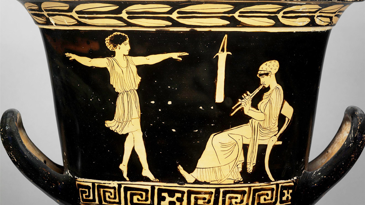 Der Aulos, ein Blasinstrument mit zwei Rohren, ist unter den antiken Musikinstrumenten das am häufigsten dargestellte. Er konnte offenbar von vielen Menschen bei ganz unterschiedlichen Gelegenheiten gespielt werden.